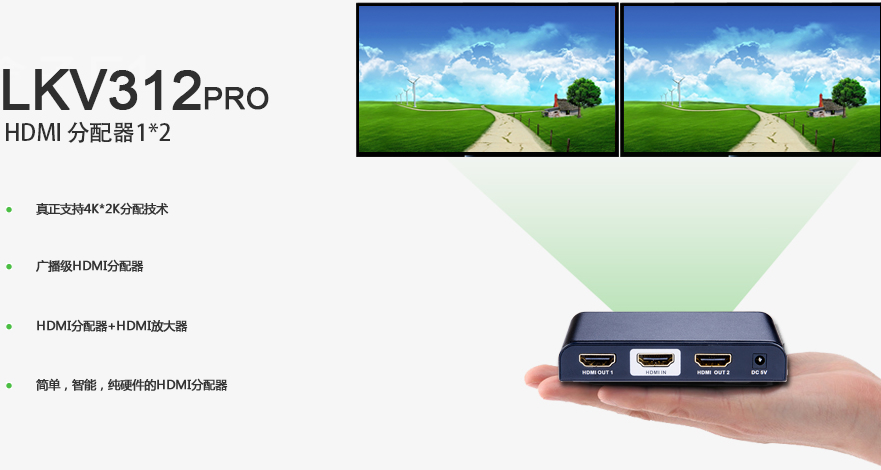 简单,智能,纯硬件的HDMI™分配器  LKV312PRO 采用纯硬件处理,即插即用。LKV312PRO将轻松分配出2路HDMI™信号。给您带来4K*2K的双重震撼.  |    | 输入HDMI™规格:480i@60Hz、480p@60Hz、576i@50Hz、576p@50Hz、720p@50/60Hz、1080i@50/60Hz、1080p@50/60Hz、1080p@24Hz 3D、720p@50/60Hz 3D、 4K×2K 支持HDMI™版本:支持最新版 HDMI™ 1.4规格,向下兼容1.3/1.2b/1.2a/1.1/1.0版本 支持HDCP版本:HDCP1.2