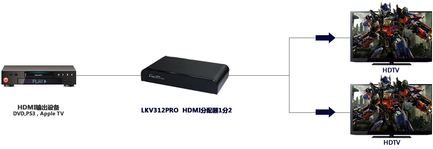 LKV312PRO HDMI™延长分配器,完全支持HDMI™1.4规格,支持4K*2K分辨率,可以将输入的1路HDMI™信号分配2路HDMI™信号同步输出,具有信号缓冲,放大能力,对输入的HDMI™信号可以输入端延长30MI,输出端延长30米,HDMI™分配器在家庭高清,零售展示,信号分配,教学应用等都有非常巨大的市场需求。
