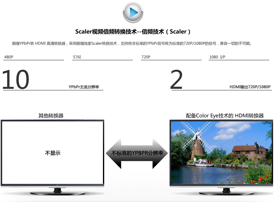 将多媒体设备(WII,PS2,DVD,等)输出的YPbPr信号转换为HDMI™信号输出,采用朗强最新的Scaler处理,支持众多多媒体设备,将YPbPr的信号(480I,576I,1080I,480P,576P,720P,1080P....)信号和左右音频直接提升为HDMI™高清标准分辨率720P或1080P主流分辨率,支持全部电视机。更采用最新的电源管理IC和工业级电路设计,带来稳定的LKV356。